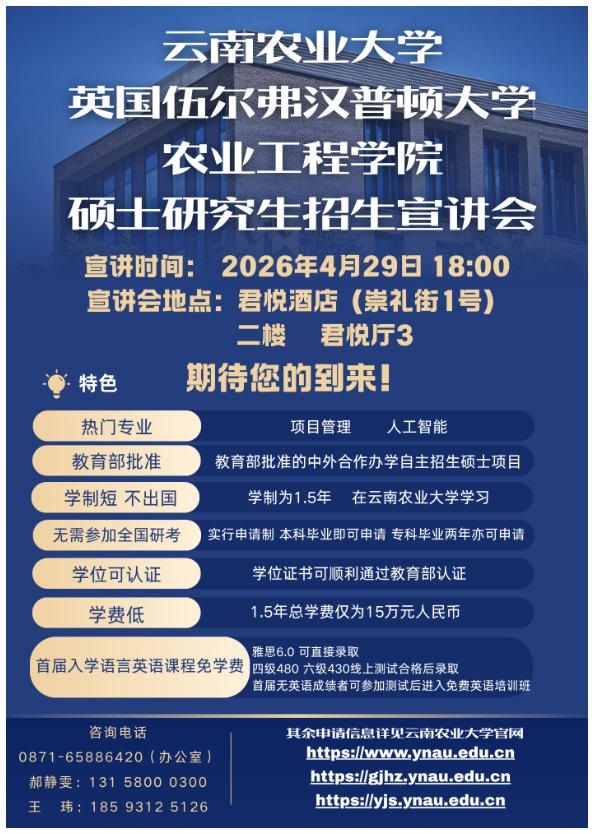 云南农业大学英国伍尔弗汉普顿大学农业工程学院硕士研究生招生宣讲会