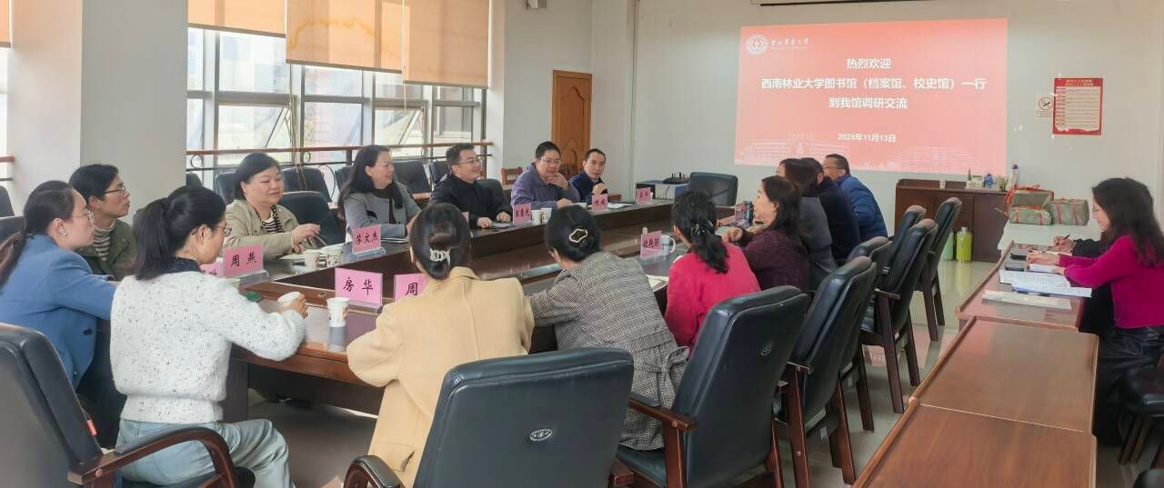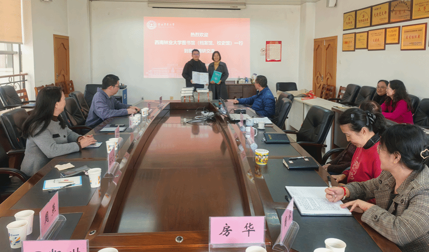 本站消息 为深入推进馆际之间的资源共享与合作,提升服务效能,优化服务模式, 11月13日上午,西南林业大学图书馆(档案馆、校史馆)馆长王雷光一行9人,到学校图书馆(档案馆、农耕文化博物馆)调研交流。会议由图书馆(档案馆、农耕文化博物馆)馆长李朝仙主持,其他馆领导及相关业务部门负责人参与座谈。