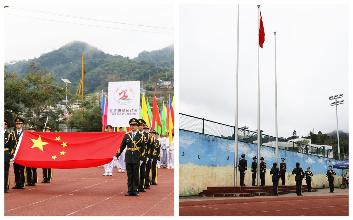 国旗护卫队、裁判员及各系部方阵、表演方队依次入场,有序站位。随着雄壮的国歌声响起,五星红旗在全体师生的注目礼中缓缓升起。