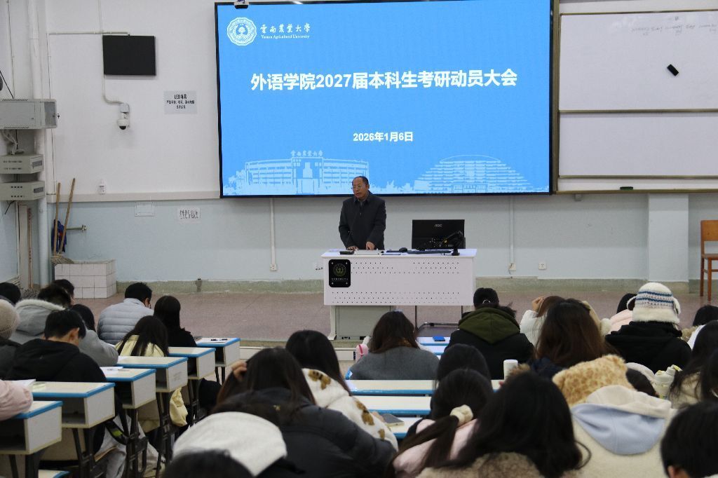 本站消息 1月6日,外语学院在明理楼阶梯教室召开2027届本科生考研动员大会。学院领导、系主任和2023级本科生及其班主任、辅导员参加会议。副院长吴广平主持会议。