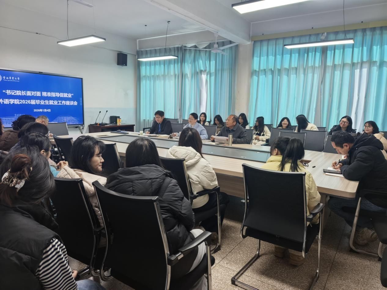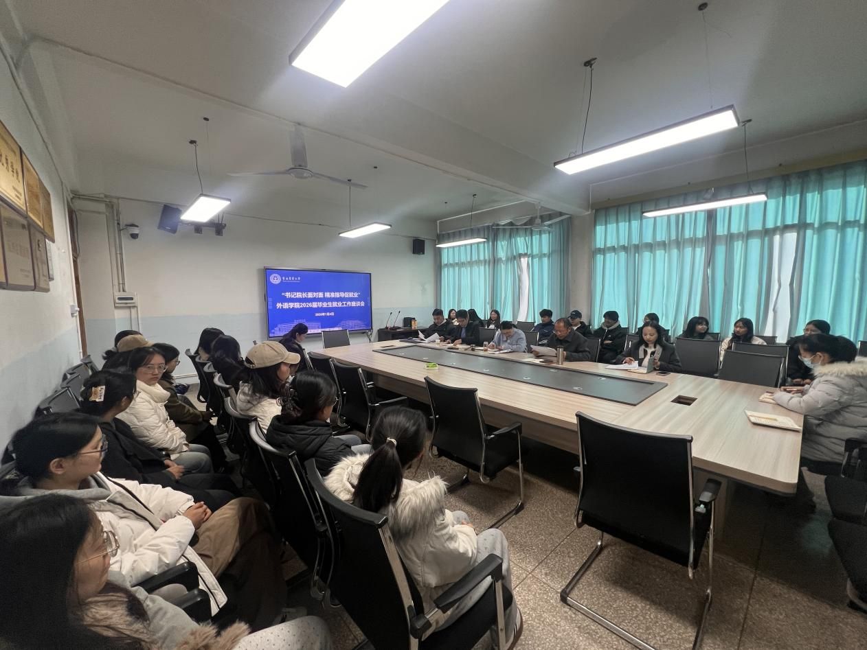 本站消息 1月4日,外语学院以“院长书记面对面,精准指导促就业”为主题召开2026届毕业生就业工作座谈会。院党委书记黎文、院长张吟松和2026届全体毕业生及其班主任、辅导员、帮扶教师参加座谈会。座谈会由学院党委副书记冯军主持。