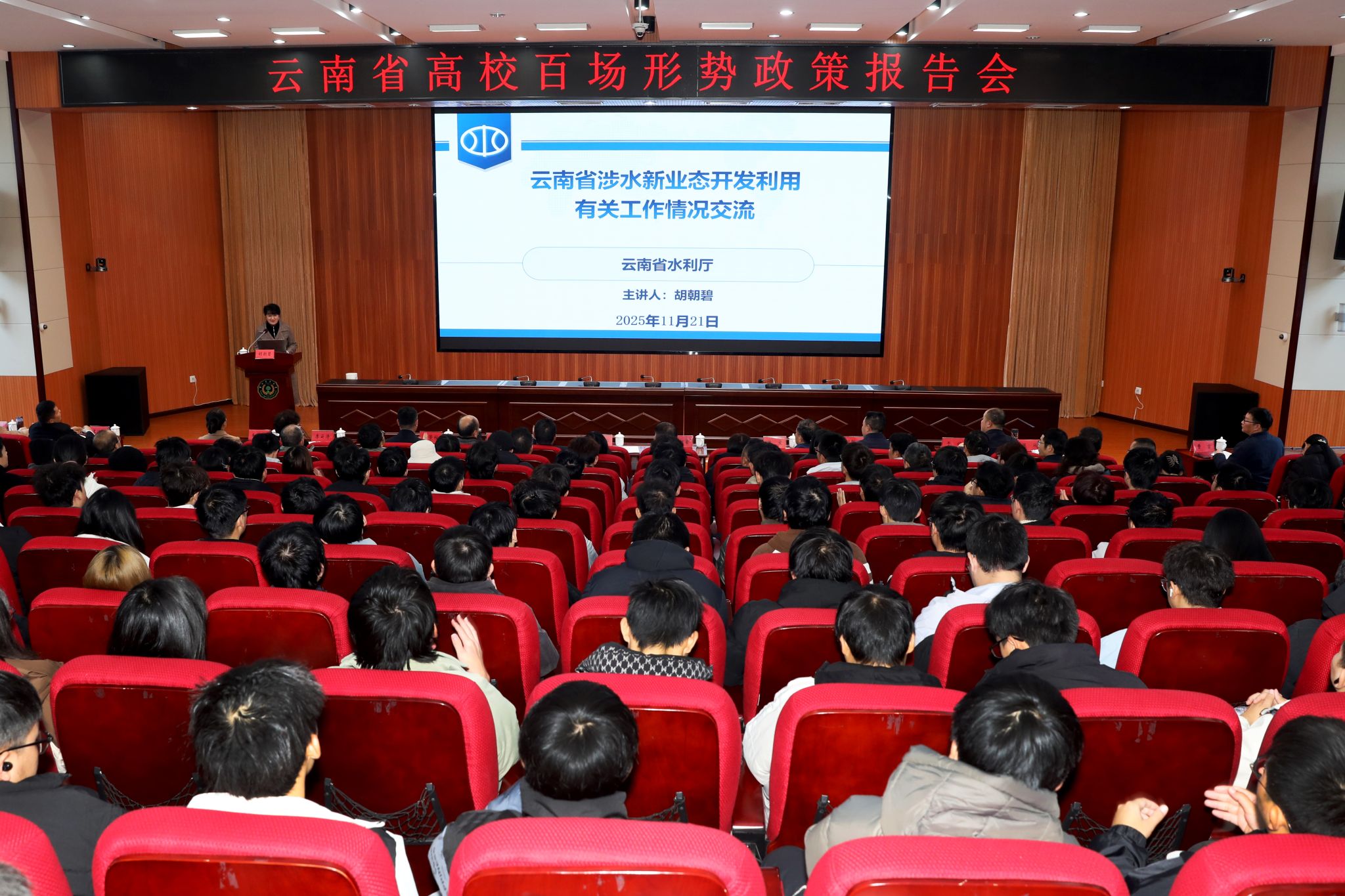 本站消息 11月21日,学校举办2025年云南省高校百场形势政策报告会,云南省水利厅党组书记、厅长胡朝碧作题为“关于云南省涉水新业态开发利用有关工作情况”的专题形势政策报告。报告会由校党委副书记徐华主持,在家校领导,水利学院、建筑工程学院等学院师生代表共200余人参加报告会。