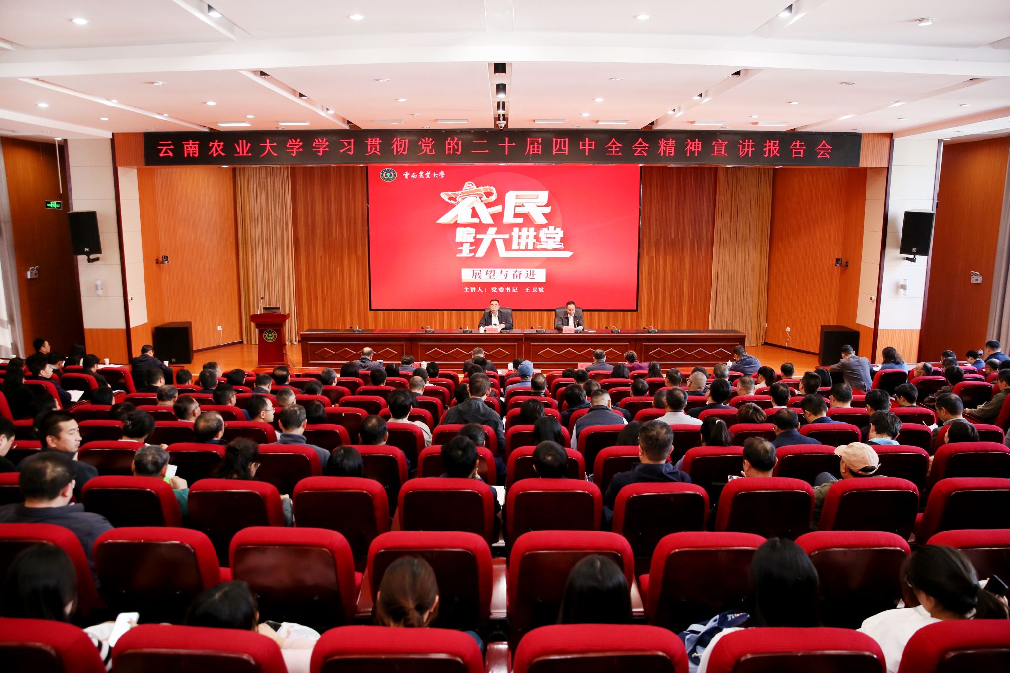 本站消息 11月14日,“农民院士大讲堂”第十五讲以“展望与奋斗”为主题开讲。校党委书记王卫斌走进大讲堂,为师生宣讲党的二十届四中全会精神。校长李永和主持会议。