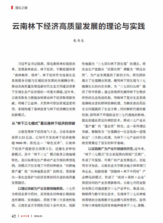 学校副校长朱书生在《云岭之窗》发表林下经济理论文章