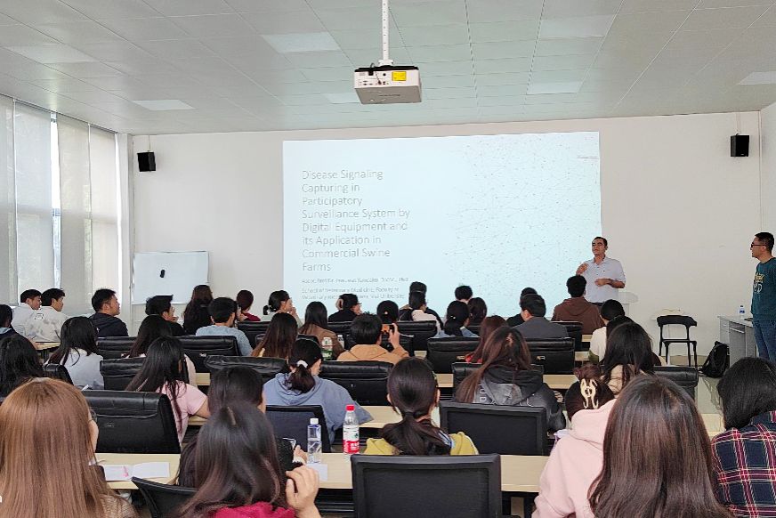 访问期间,Panuwat Yamsakul与动物医学院领导及教师们进行了深入的座谈交流。参观了学院各科研团队的实验室,为师生们带来了精彩的学术报告,与猪病研究团队进行了深入交流。