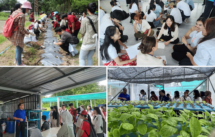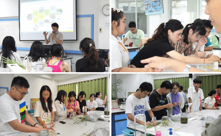 活动期间,研学团成员在泰国艺术大学碧武里校区(Phetchaburi IT Campus)参加了农业生产实践、田间考察、实验操作、风俗文化交流等系列丰富的研学课程。通过学习,同学们了解了泰国艺术大学动物科学与农业技术学院的主要科研方向和研究成果,了解了鲶鱼养殖与蔬菜种植的循环体系,学习并参与了泰国水稻种植、万寿菊种植、山羊养殖等实践活动,开展了动物饲料成分鉴定、香料植物成分提取等实验,提升了对该学科领域的认知与实践能力。