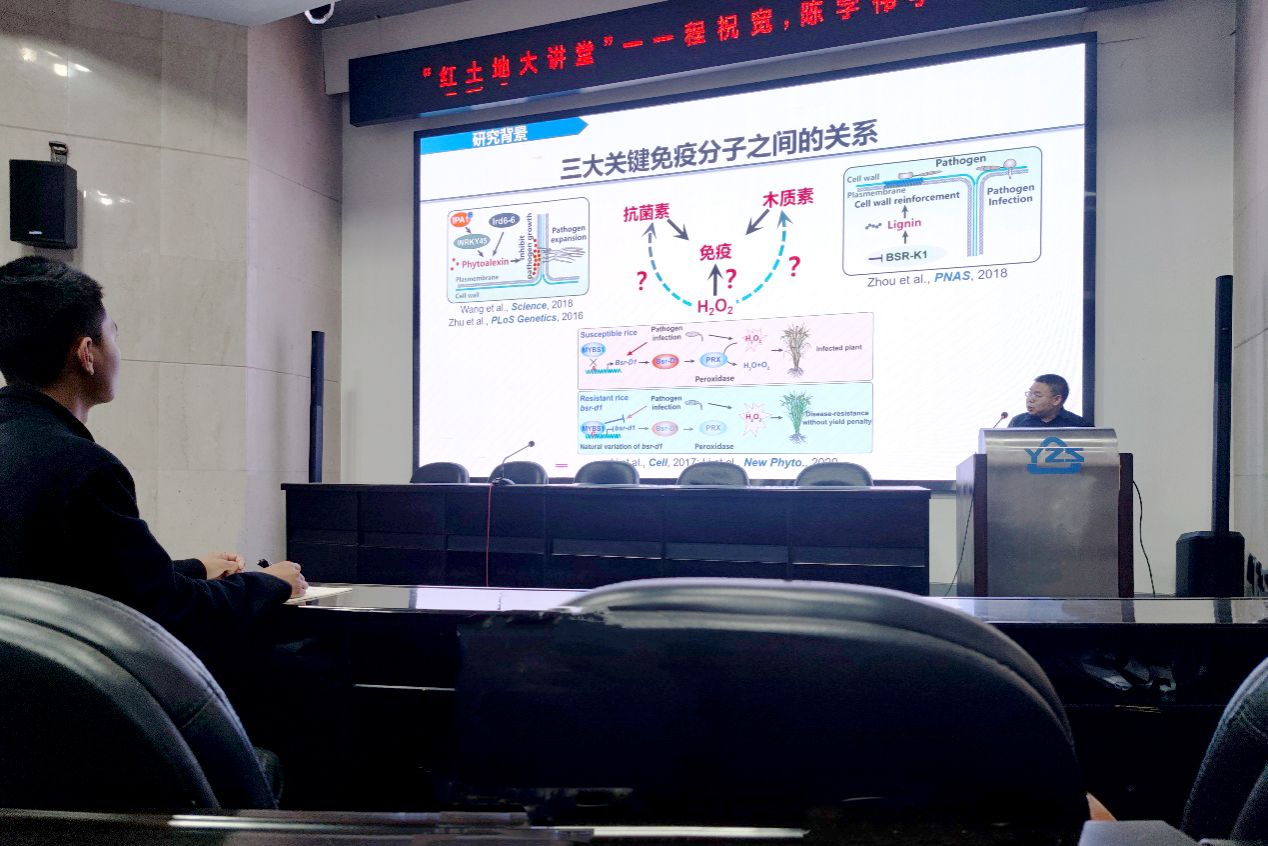 随后,陈学伟教授介绍了团队最新研究成果“水稻转录因子HPS1通过感应H2O2增强植物免疫的机制”。陈学伟教授介绍,课题组是基于水稻抗菌素、木质素和H2O2三大关键免疫分子之间的关系,聚焦HPS1、OsLACs、和H2O2在增强水稻免疫中的调控机制开展了大量研究,阐明了HPS1通过两条途径增强水稻免疫提高稻瘟病抗性。报告中陈学伟教授的生动讲解和精彩的图文为会场师生带来了一场视觉享受。