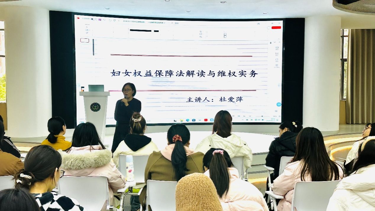 本站消息 11月27日下午,由学校妇联、工会、党委研究生工作部共同主办的《中华人民共和国妇女权益保障法》解读与维权实务活动在学生社区共享交流厅举行,活动邀请到云南师范大学杜爱萍副教授主讲,全校女工委员及研究生等180余人参加了本次活动。