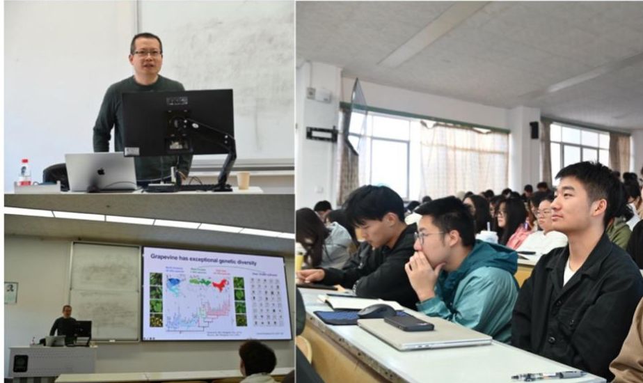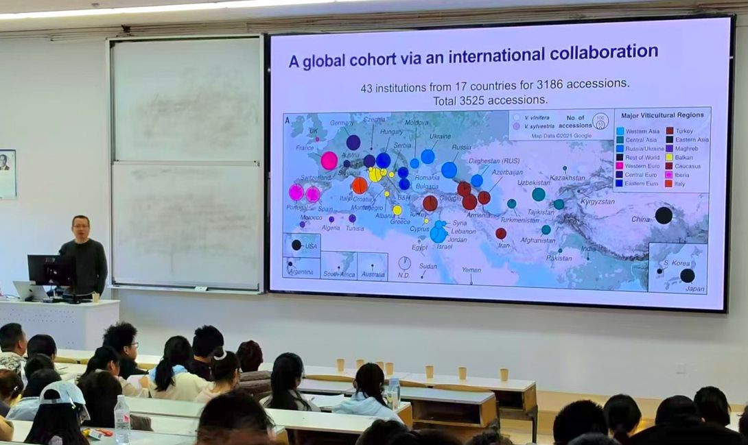 讲座以古希腊神话中的酒神狄俄尼索斯为引,将葡萄的传奇故事与现实世界的葡萄进化与驯化相结合。陈玮教授从遗传学的视角,深入解析了葡萄在历史长河中演变的根本机制,以及人类和环境在其进化和驯化中发挥的重要作用。他详细讲述了葡萄从野生状态到多样化栽培品种的转变,揭示了地球环境变化导致葡萄群体的分化及进化,带领师生们领略了一场穿越时空的葡萄驯化之旅。