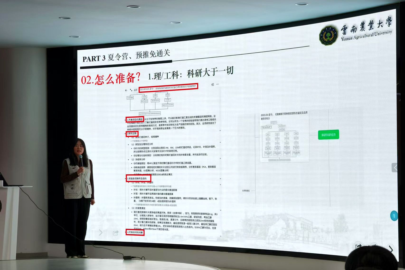 本次分享会邀请了农学院张笑云、经管学院宋佳美和烟草学院李仁蓉三位同学依次分享了保研经验与心得体会。她们结合自身经历,分别从前期信息获取及准备流程、夏令营准备细节和个人陈述与推荐信撰写等方面进行了分享,让同学们对保研流程及方向有了更深入地了解。
