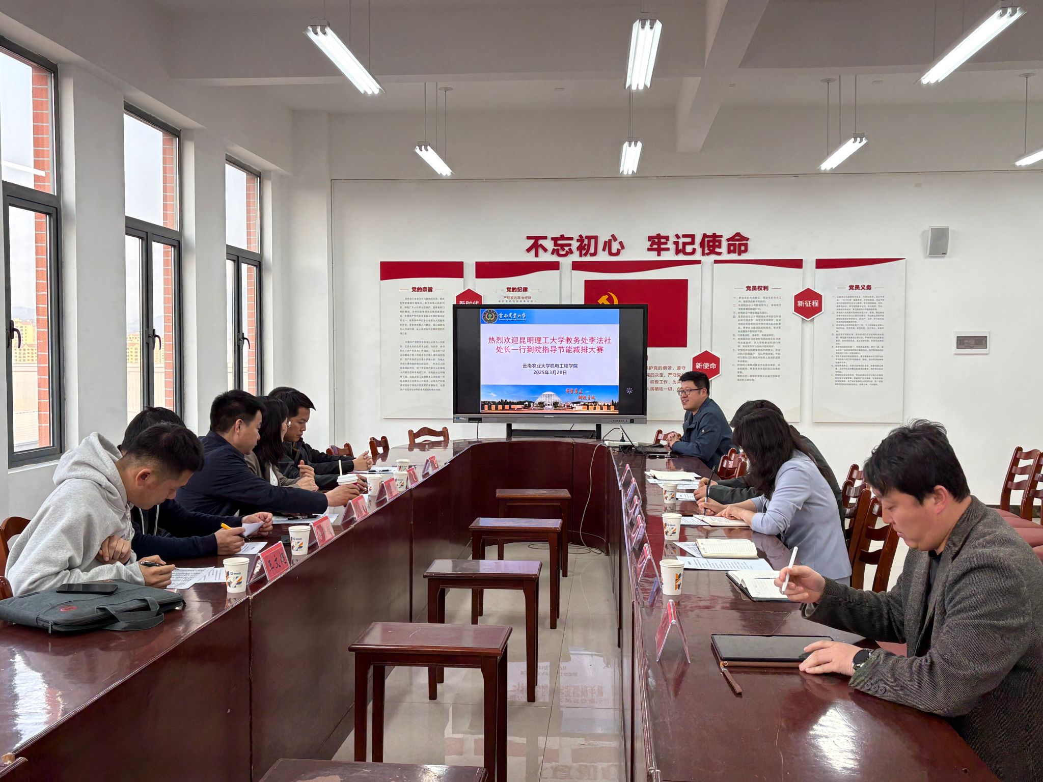 为进一步推动全省节能减排事业与绿色低碳发展,助力高校创新人才培养,3月28日,第四届云南省大学生节能减排社会实践与科技竞赛筹备工作推进会在学校举行。昆明理工大学教务处李法社处长一行到机电工程学院指导赛事筹备工作。学院党委书记陈立畅、副院长黄峻伟,相关教师和竞赛筹备相关工作人员参加了会议。