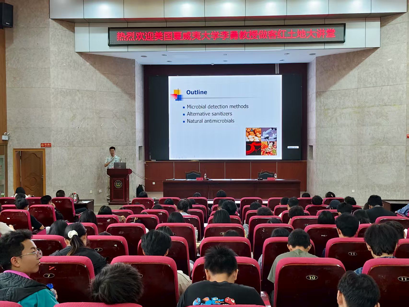 李勇教授长期致力于食品微生物控制领域的研究,在国际相关领域享有盛誉。此次报告中李勇教授围绕“Detecting and Controlling Foodborne Pathogenic Bacteria Challenges and strategie”展开,深入浅出地介绍了食品微生物控制的方法、控制效果、控制的动力学过程等内容。通过大量翔实的数据、生动的案例以及前沿的研究成果,为现场师生呈现了该领域的最新动态和发展趋势,让师生们深受启发。