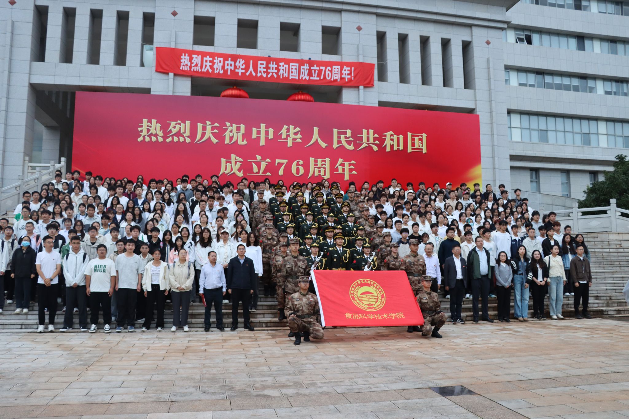 本站消息 10月10日清晨,食品科学技术学院师生齐聚至诚楼前广场,开展“在国旗下集合”活动。学院党政领导班子成员、全体辅导员和班主任、入党积极分子、青马班全体学员,以及2025级本科、研究生共400余人参加。活动由学院党委副书记黄启超主持。