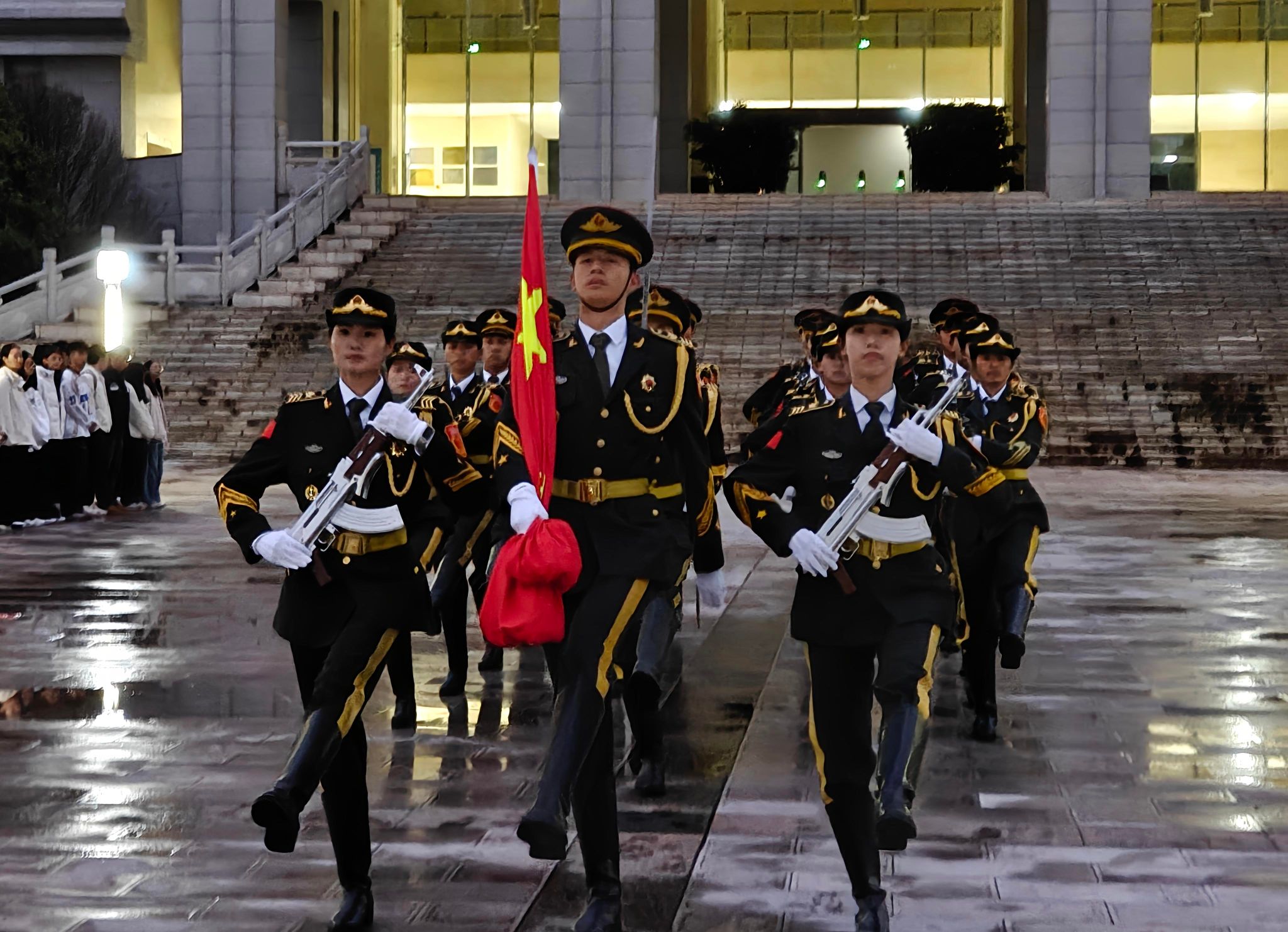 晨光初露,师生列队整齐。国旗护卫队护送国旗至升旗台,国歌声中,五星红旗冉冉升起,全体肃立行注目礼。