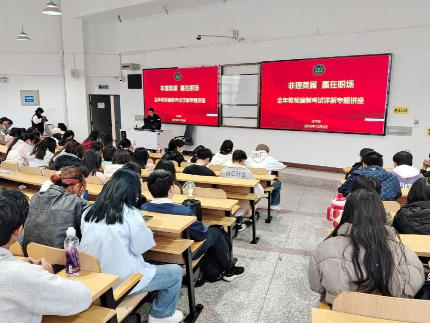 本站消息 12月3日下午,理学院2025年“非理莫属·赢在职场”系列教育活动之教师编制备考与指导专题讲座在逸夫楼A502教室举行。本次讲座特邀资深讲师喻铭航主讲,150余名学生参加,旨在破解教师类岗位报考与备考难题,
