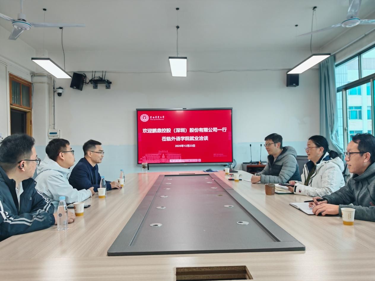 本站消息 12月23日,鹏鼎控股(深圳)股份有限公司人事负责人朱天宇一行3人到外语学院洽谈院企合作。学院院长张吟松、东南亚语系系主任朱贵平参加座谈,学院党委副书记冯军主持座谈会。