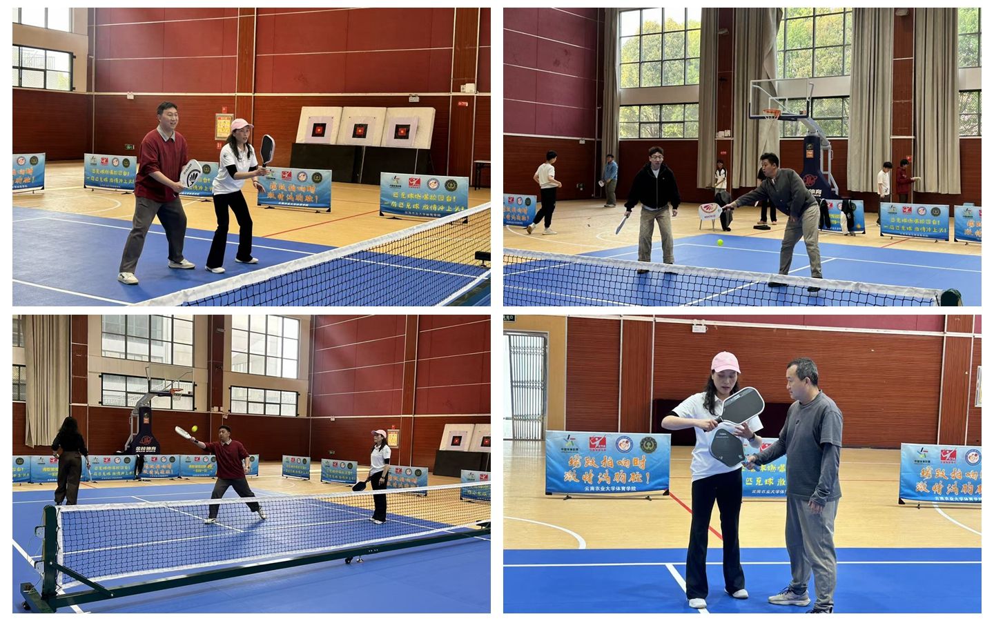 本次培训由学生处、体育学院统筹组织,体育学院教师及“云农体育志愿轻骑兵”团队共同承担教学任务。培训坚持“从零起步、循序渐进”原则,采用“理论+实操”教学模式,系统讲授匹克球运动的文化起源、场地规则、握拍方法、丁克球技术、发球接发球技巧,并现场演示高压球与高挑球等战术动作,帮助参训辅导员快速掌握基础技能。
