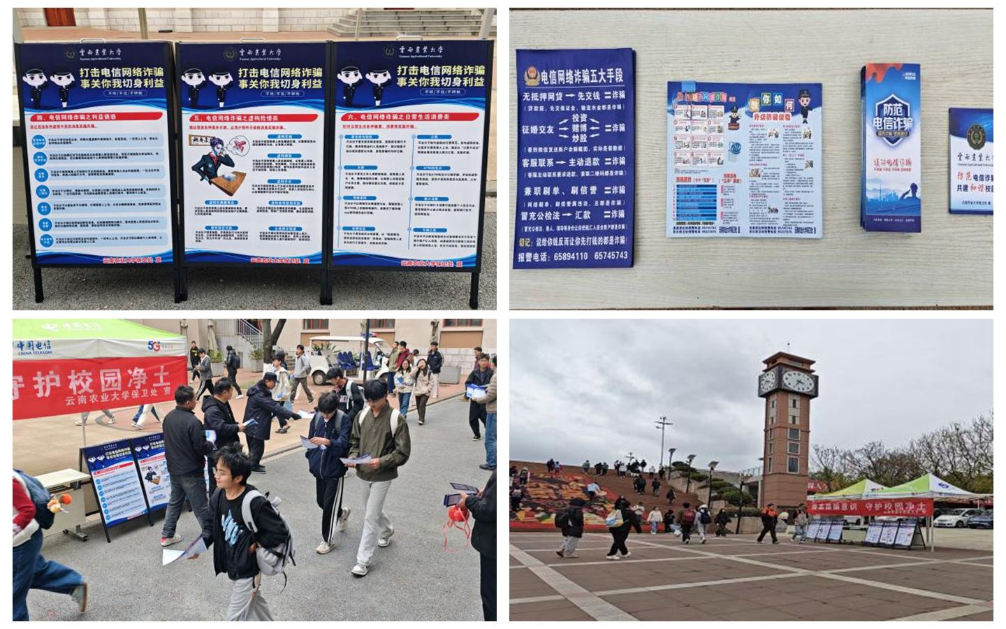 宣传周期间,保卫处聚焦教学楼、食堂、宿舍区、校园主干道、图书馆等人员密集区域,精心布设了主题鲜明、内容详实的反诈宣传横幅与宣传展板,并现场发放反诈宣传手册,营造“人人知反诈、处处有警示”的浓厚氛围。宣传材料图文并茂,深度拆解刷单返利、虚假网贷、冒充公检法、杀猪盘、AI 换脸冒充亲友等高校高发诈骗手段,通过剖析典型案例、揭露诈骗套路、普及防范技巧,让过往师生驻足学习、直观易懂。
