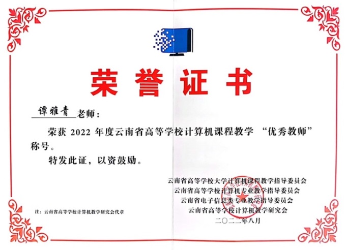 本站消息 近日,由云南省高校计算机基础教学指导委员会、云南省高校计算机专业教学指导委员会、云南省高校电子信息教学指导委员会、云南省高校计算机教学研究会联合举办的云南省高校计算机课程教学优秀教师评选,经过网络初评、现场决赛,评选出2022年度云南省高校计算机课程教学十佳教师,我校大数据学院青年教师谭雅青名列十佳第二。