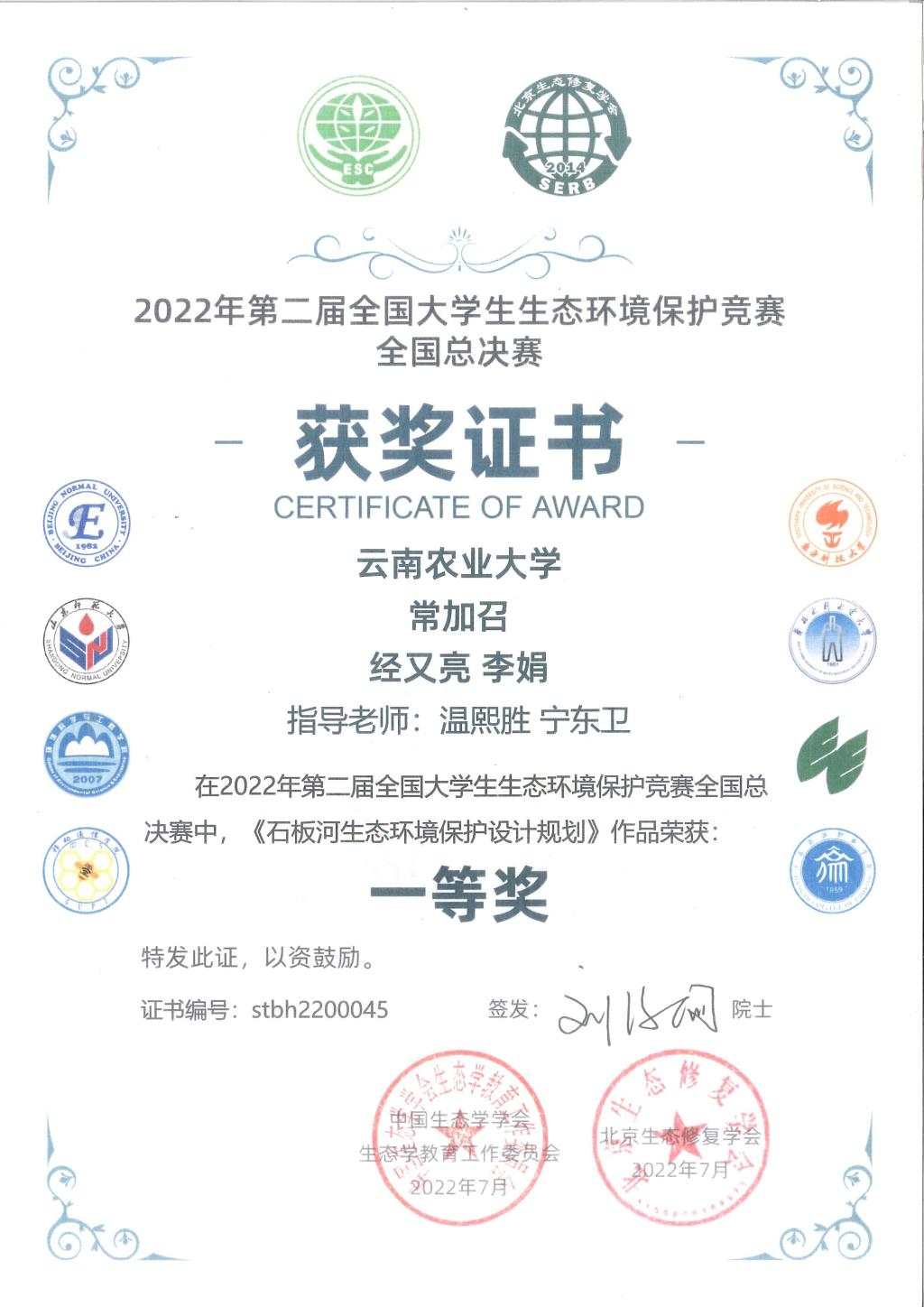 本站消息 近期,由中国生态学学会教育工作委员会、北京生态修复学会主办,赛氪承办的“2022年第二届全国生态保护竞赛”全国大学生水土保持与荒漠化防治及相关专业创新设计大赛全国线上决赛顺利举办。我校水利学院精心组织代表队参赛,最终获全国总决赛一等奖1项、省级一等奖4人。由我校水利学院水土保持与荒漠化防治专业2019级学生经又亮、常加召、李娟同学在温熙胜博士和宁东卫老师指导下完成的作品《石板河生态保护设计规划》,在全国决赛的257项作品中总评分排名第六,荣获“2022年第二届全国生态保护竞赛”全国总决赛一等奖。本次获奖是我校水土保持与荒漠化防治专业建设的一个标志性成果,水利学院将以此为契机,全面深入拓展水土保持与荒漠化防治专业亮点建设和创新人才培养。