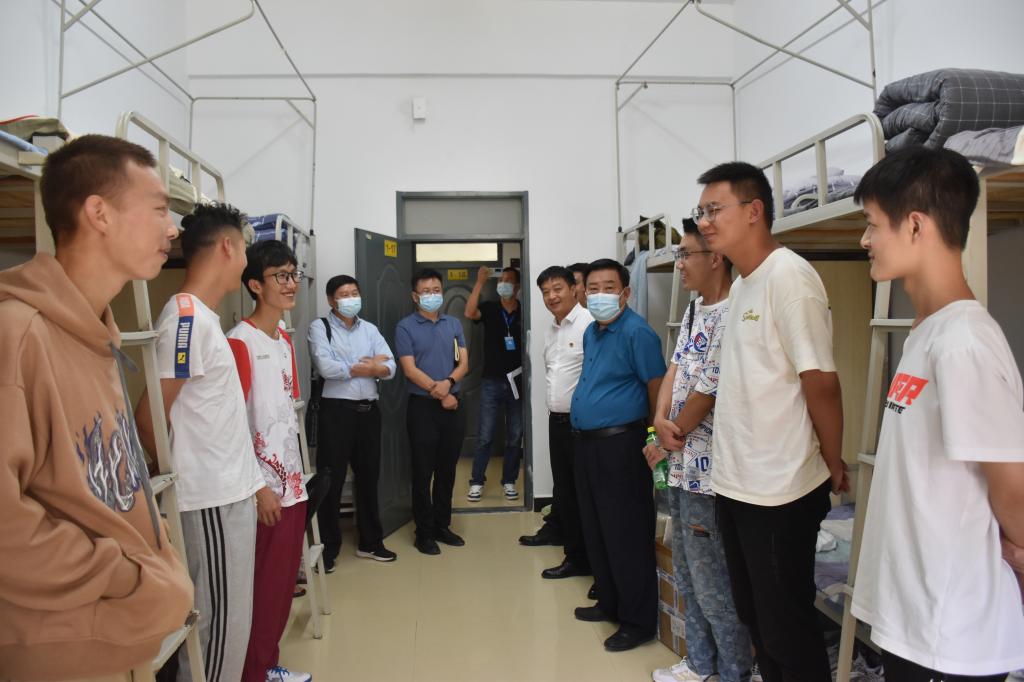 范源洪一行在学院党委书记杜华波、院长杨学虎的陪同下,先后到校医室、食堂、商铺、学生宿舍等视察设施设备及安全卫生状况,认真查阅台账记录,听取汇报,检查物资存储情况,随后召开座谈会。