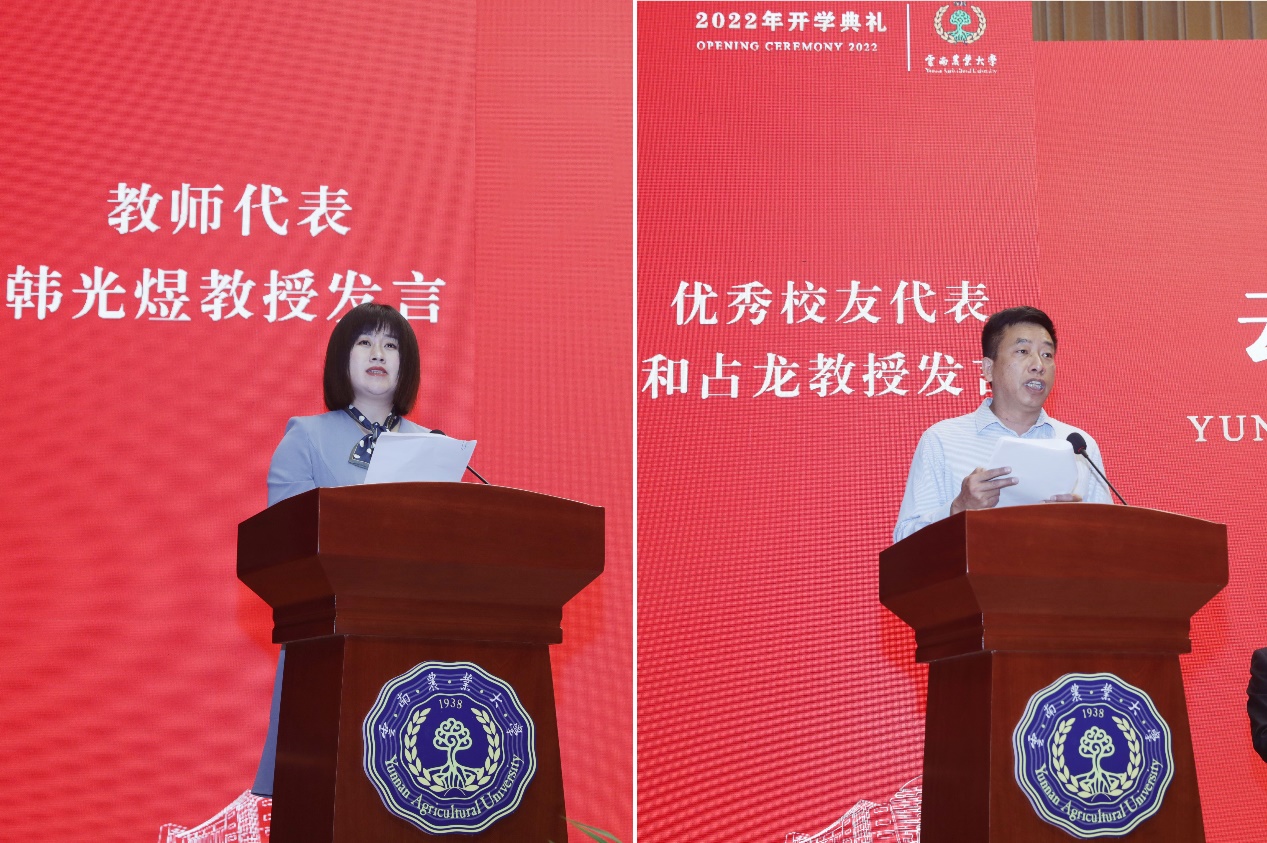 植物保护学院教授韩光煜代表全校1800余名教师对即将踏上学业生涯新征程的2022级所有新同学表示最衷心的祝贺和热烈的欢迎,希望同学们一是把握当下,脚踏实地,全身心投入自己的学业,认真地对待每一件事情;二是冷静思考、理性行动,以积极态度迎接面对的每一次挑战;三是树立崇高的理想,厚植学农、强农、知农、爱农的家国情怀,筑牢人生根基,为祖国繁荣昌盛贡献自己的力量。