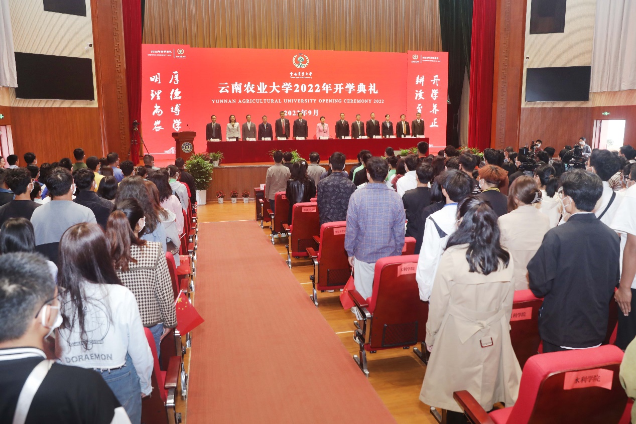 开学典礼在全体起立奏唱国歌中正式开始。黎素梅代表学校向12413名新同学加入云南农大这个温暖的大家庭表示热烈的欢迎和祝贺。她介绍学校自1938年创立以来,“云农人”潜心稼穑、躬耕疆域,始终与祖国发展同频共振、同向同行,推进农、工、经、管、理、医、法等多学科交叉融合发展,形成了“开学养正培育边疆民族人才,耕读至诚演绎生物资源优势”的办学特色,取得优异成绩,学校各项建设实现突破性进步;以时代楷模朱有勇院士为代表的17万余名“云农人”,把论文写在祖国大地上,服务国家脱贫攻坚、乡村振兴战略和支撑经济社会发展,作出了突出贡献。