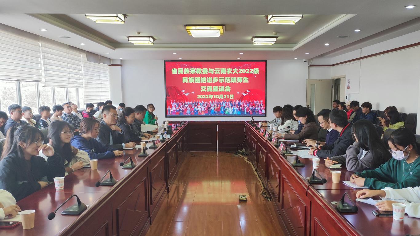 本站消息 2022年10月21日,云南省民族宗教事务委员会在我校举行2022年民族团结进步示范班师生交流座谈会,省民族宗教委一级巡视员盘艳阳、我校党委副书记徐华、省民族宗教委和学校教务处有关同志以及全体2022级民族团结进步示范班学生参加了座谈会。