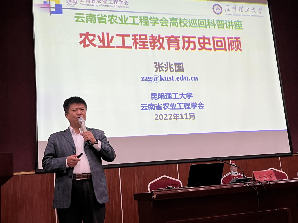 本站消息 为更好发挥农业工程学会在服务社会助力乡村振兴方面的作用,根据云南省科技协会项目要求,由云南省农业工程学会理事长单位昆明理工大学、副理事长单位云南农业大学和云南师范大学联合组建宣讲团,开展“农业工程科技 助力乡村振兴”高校巡回科普讲座活动。2022年11月1日,宣讲团走进我校,在图书馆报告厅举办科普讲座活动,学会理事长张兆国教授、常务理事张无敌教授、副秘书长张付杰作报告,来自机电工程学院、水利学院、大数据学院、建工学院的100多名师生参加了本次活动并参与现场交流互动。报告会由机电工程学院副书记兼副院长李文峰主持。