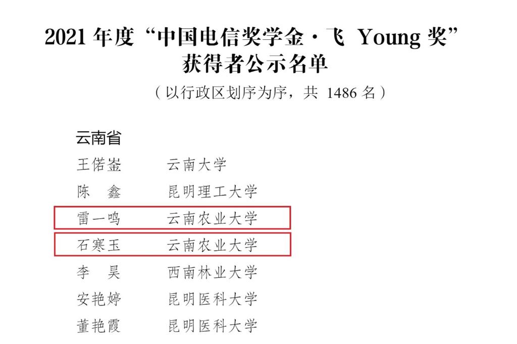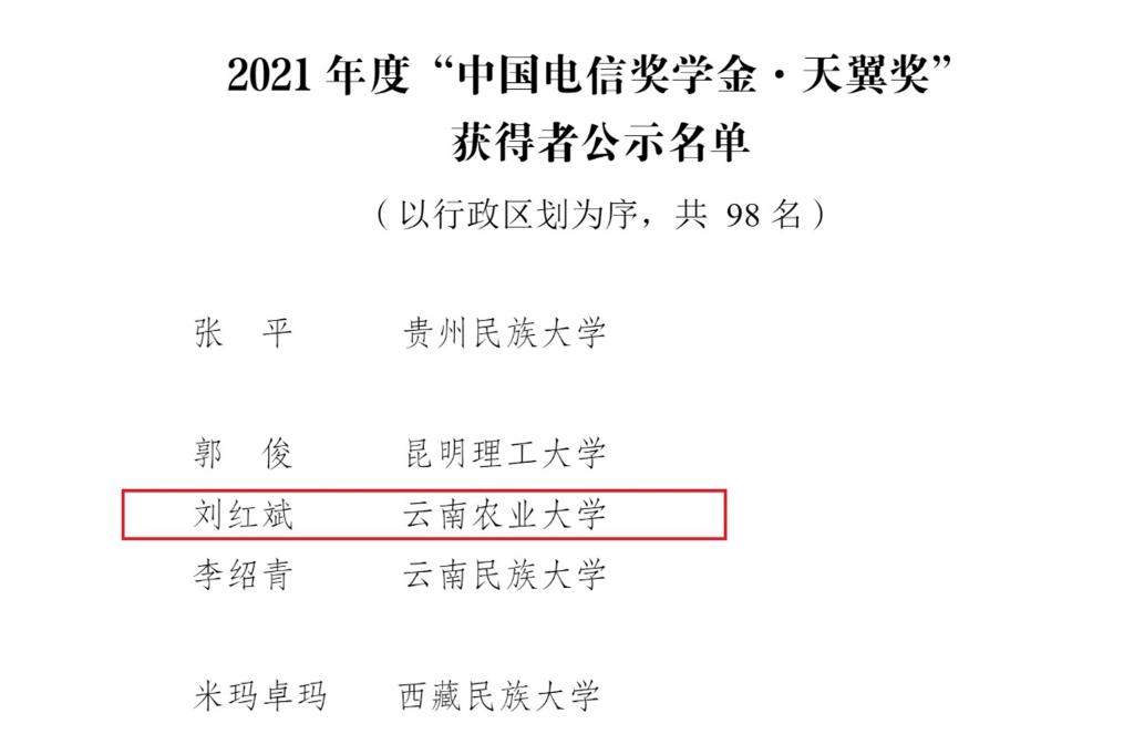 本站消息 近日,全国学联公示了2021年度“中国电信奖学金”获得者名单。我校植物保护学院研究生刘红斌荣获“中国电信奖学金·天翼奖”,资源与环境学院本科生雷一鸣、人文社会科学学院本科生石寒玉荣获“中国电信奖学金·飞Young奖”。