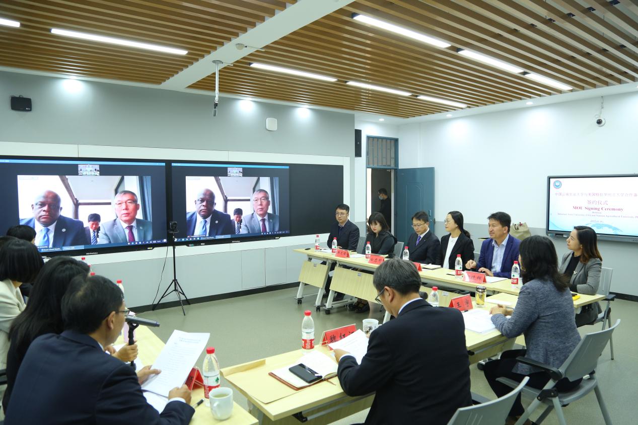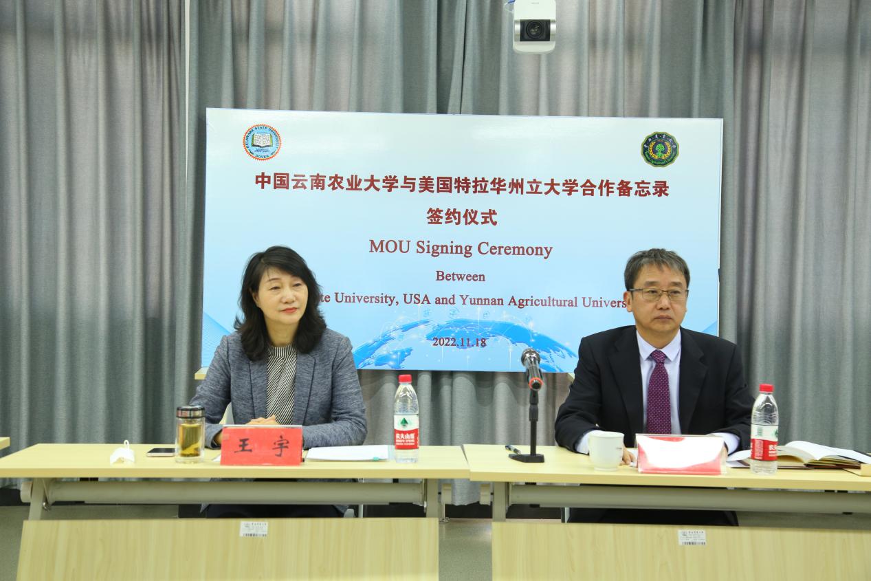 本站消息 2022年11月18日下午,我校与美国特拉华州立大学合作备忘录“云签约”仪式在逸夫楼C区301会议室举行。云南省人民对外友好协会专职副会长王宇出席签约仪式并致辞,副校长魏红江代表学校签署合作备忘录,各相关部门、学院负责人参加签约仪式。签约仪式由对外合作交流处处长朱耀顺主持。