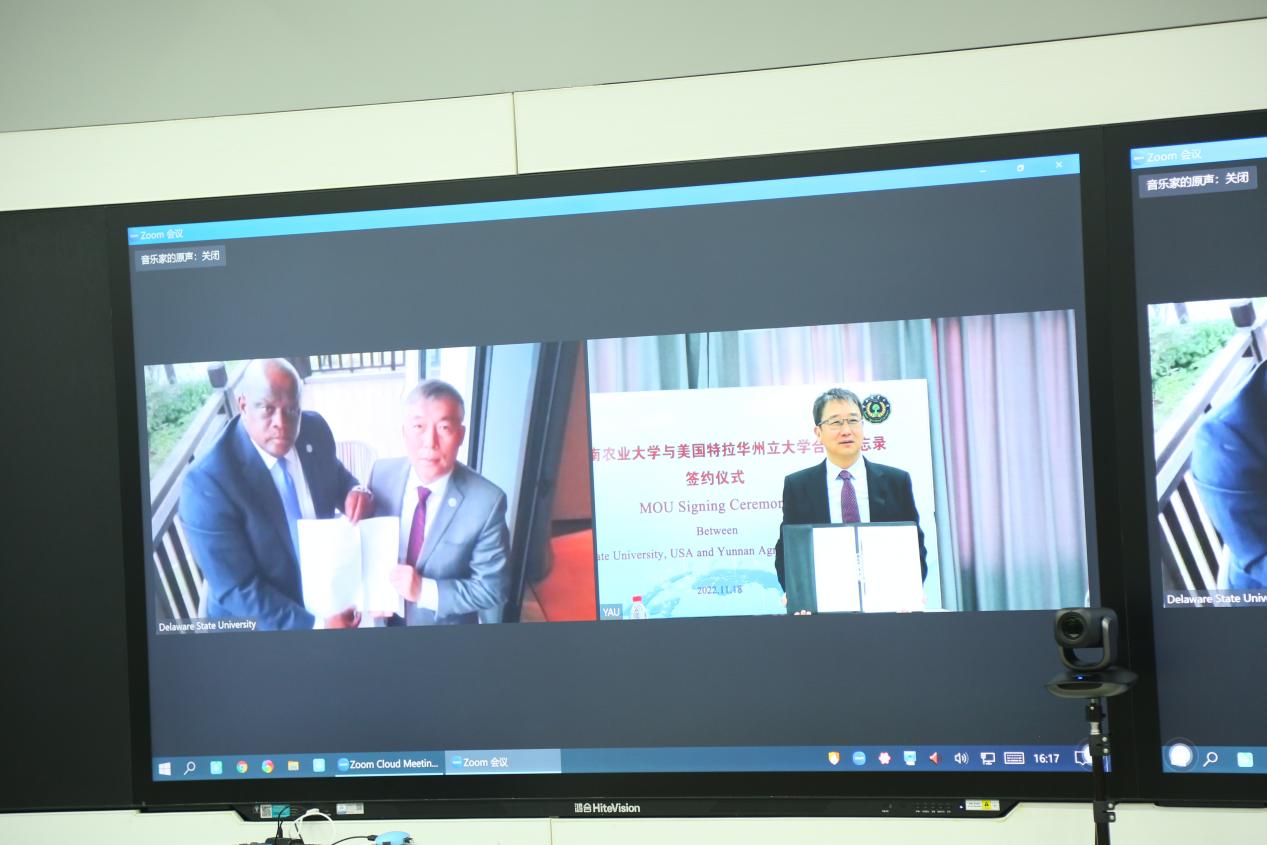 在王宇女士和与会学院、部门负责人的共同见证下,魏红江与安东尼奥•波义尔代表双方签署“云签约”合作备忘录。今年是云南省与美国特拉华州正式缔结友好省州关系5周年,两校合作备忘录的签署,将为两省州友好交流关系发展注入了新动力。