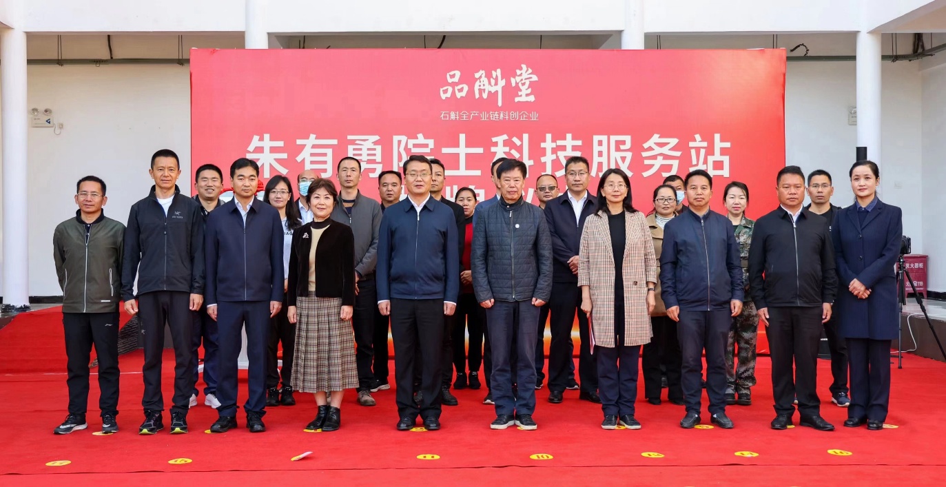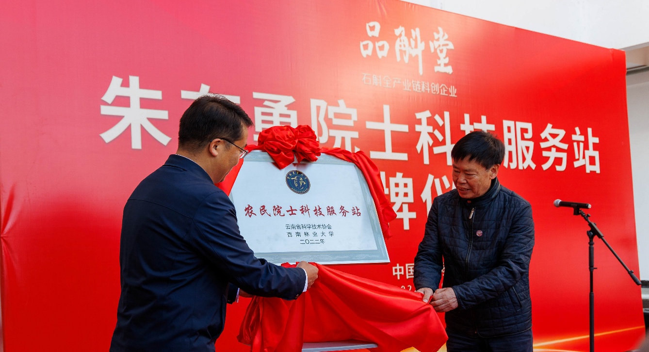 朱有勇指出,中药材是云南省仅次于烟草的朝阳产业之一,龙陵作为全国重要的石斛产业基地,自然条件优越、石斛资源丰富、种植历史悠久、产业发展良好,是名副其实的“中国紫皮石斛之乡”,在发展生物医药产业方面具有得天独厚的优势。云南品斛堂生物科技有限公司作为地方龙头企业,肩负着发展中药材产业、夯实脱贫攻坚成果、助力乡村振兴的重要使命。“农民院士科技服务站”建成后,院士专家团队将发挥专业优势,重点开展紫/铁皮石斛品种选育、林下石斛生态种植标准体系建设和石斛精深加工产品研发等工作,助力龙陵石斛实现栽培良种化、生产规范化、经营标准化、产品品牌化,推动龙陵石斛产业转型升级,带动群众增收致富、助力乡村全面振兴。仪式上,朱有勇、牛永东共同为“服务站”揭牌。