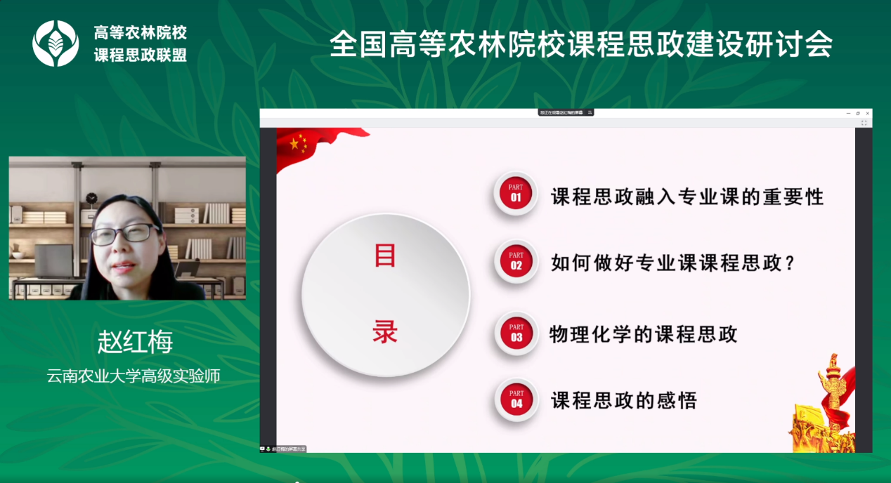 在主题报告环节,我校理学院教师赵红梅作为西部农林高校唯一的一线教师代表受邀作《物理化学与课程思政的融合》报告,分享了自己在课程思政建设中的教学研究、课程建设等方面的经验与做法。赵红梅老师首次提出课程思政催化剂理论,课程思政能在专业课教学过程中起到更好的催化作用,以协同促创新,促进学生对专业知识的学习,提升学生创新实践能力,更好的服务“三农”,为我校今后专业课课程思政发展起到了较好的带头作用。