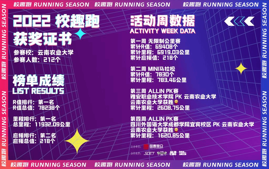 第二期全国高校“2022RUNNING——校趣跑”共有16所高校参加,含云南省6所高校(云南农业大学、云南财经大学、昆明学院 、昆明城市学院、玉溪师范学院、云南体职院)上万名大学生同步开启为期一个月四周的健康线上跑PK。