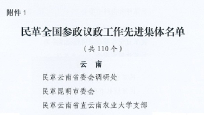 本站消息 近日,为全面总结民革十三大以来参政议政工作,表彰先进、树立典型,激励民革各级组织和广大党员继续踔厉奋发、锐意进取,推动民革参政议政工作不断迈上新台阶,民革中央对五年来在参政议政工作中作出突出贡献的先进集体和先进个人进行表彰。民革云南省直云南农业大学支部获“民革全国参政议政先进集体”称号,全省仅有三个集体受到表彰。同时,还获得云南民革省委2017-2022参政议政先进集体一等奖。