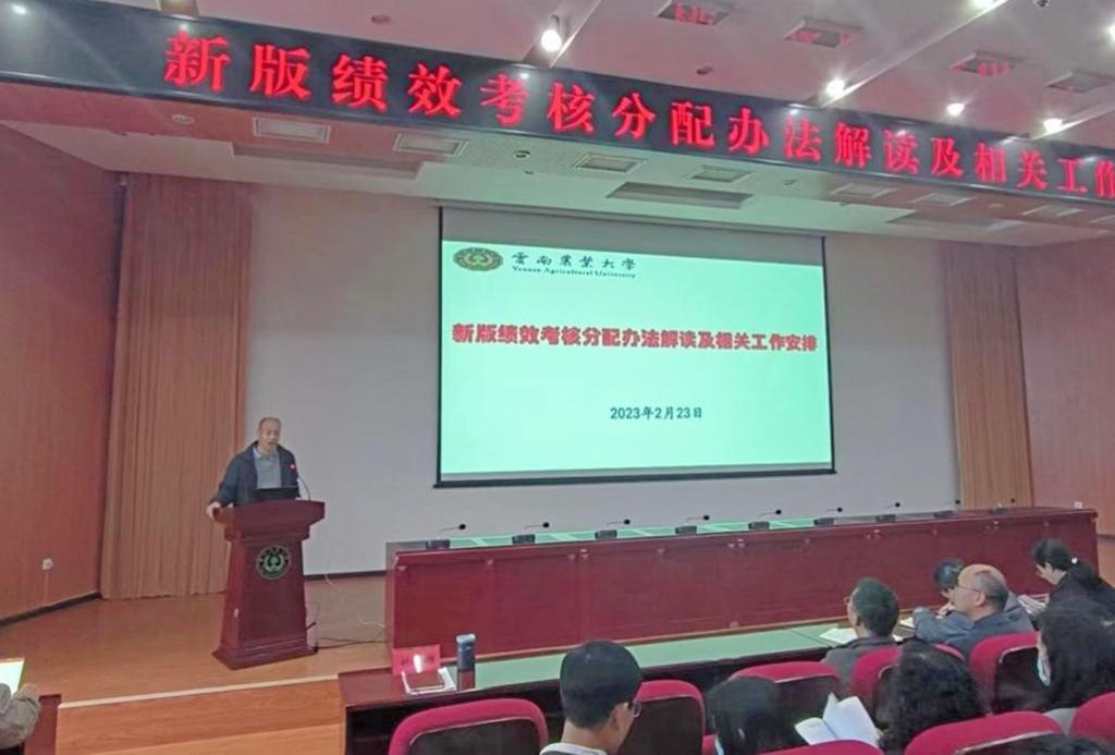 本站消息 2023年2月23日上午,为切实推进学校新修订绩效考核分配工作,加强绩效政策解读和指导,学校在耕读楼二楼报告厅召开2023新版绩效考核分配办法解读及相关工作安排会议。学校各学院书记、院长、部门工会主席(委员)、绩效分配经办人、教职工代表、民主党派代表;管理教辅部门主要负责人、绩效分配经办人共160余人参加会议,会议由赵正雄副校长主持。