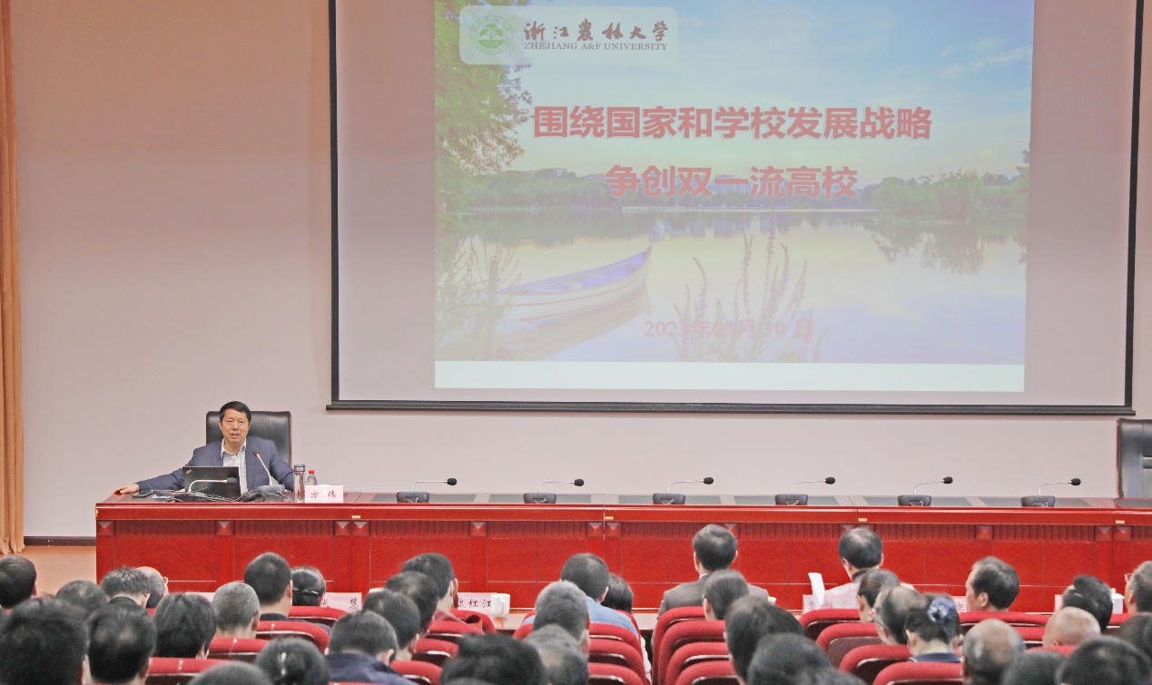 方伟作题为《围绕国家和学校发展战略 争创双一流高校》的专题讲座。他以党的二十大报告提出的“加强基础学科、新兴学科、交叉学科建设,加快建设中国特色、世界一流的大学和优势学科”为引题,从“以先进文化为引领建设特色鲜明的一流学科、以党的建设为引领建设一支高水平干部队伍、以乡村振兴为己任建设特色农业美丽风景线”三个方面,结合古往今来的一些实例,详细讲述了浙江农林大学在建设发展中的经验做法及取得的一系列成果成效。