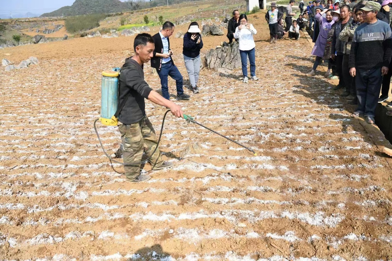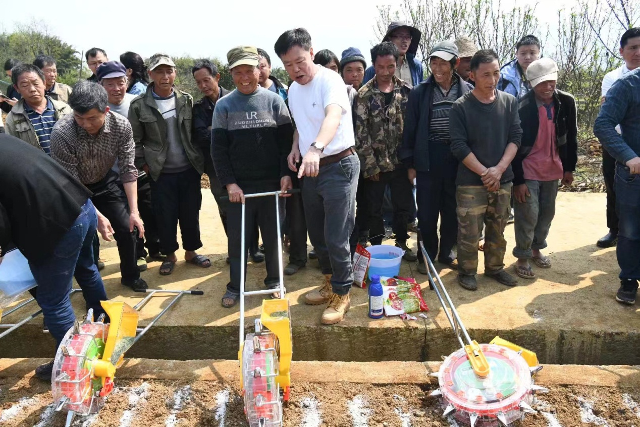 培训结束后,朱有勇院士及其团队到田间地头开展实操培训,手把手教授卡房镇苟街村农户进行种子拌种、小型机械直播、喷洒封草药剂等农事操作,同时介绍了水稻旱种技术简单、工作效率高的特点。当地农户感谢朱有勇院士一直以来对卡房镇苟街村的牵挂!纷纷表示40多年前,朱有勇院士作为知青在卡房镇苟街村委会下乡,现在又带着水稻旱作的科技成果来到这里,有了院士和团队专家的帮助和支持,有信心做好水稻旱作工作,吃上自己种的好大米。