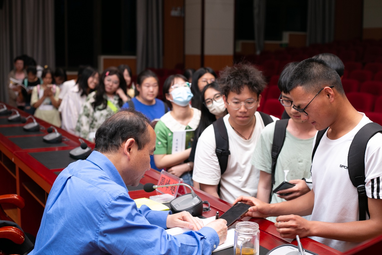 讲座结束后,同学们纷纷请周教授在赠送的精美油画画册上题字签名。