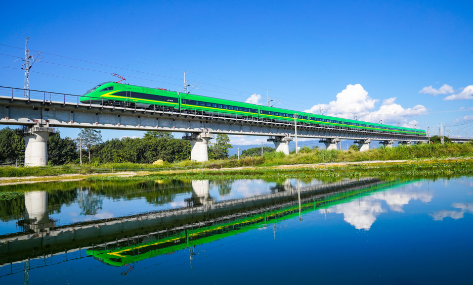资料图 复兴号动车组飞驰在中老铁路橄榄坝特大桥上 杨林 摄