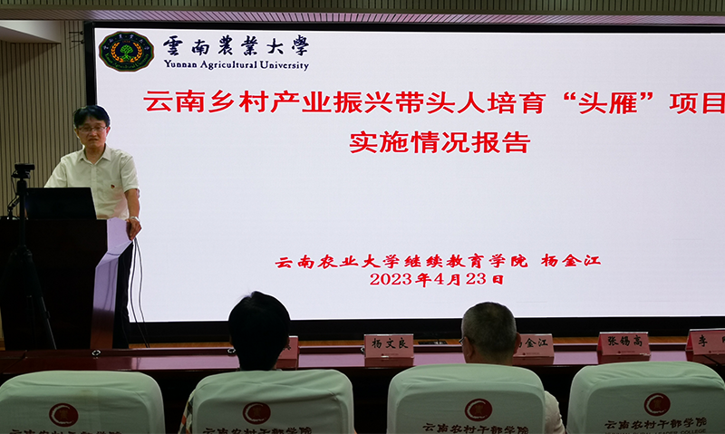 本站消息 2023年4月23日上午,农业农村部组织召开2022年度乡村产业带头人培育“头雁”项目评价工作答辩会。受学校领导委托,“头雁”项目负责人、云南农业大学继续教育学院院长、云南农村干部培训基地副主任杨金江参加答辩。