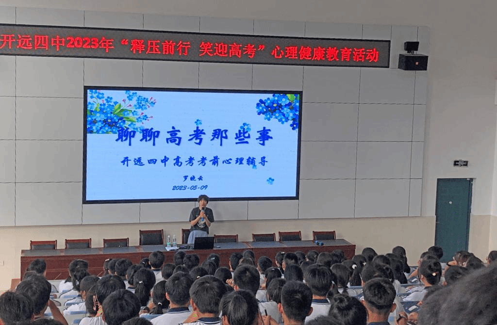 在开远市第四中学,通过生动活泼的案例和团辅活动讲授调节压力、情绪的知识,并通过才艺展示鼓励毕业生们克服畏难情绪,挑战高考、成就自我。