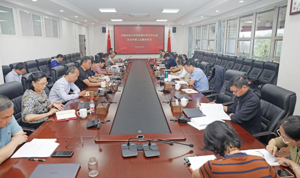 本站消息 5月18日,学校党委理论学习中心组(扩大)以“深学笃用习近平新时代中国特色社会主义思想,为推进中国式现代化贡献云农力量”为主题开展2023年第三次集体学习。会议由学校党委书记黎素梅主持,党委委员、校领导、各二级党委及党总支书记参加学习。副校长杨生超、赵正雄,农学与生物技术学院党委书记李富生、动物医学院党委书记杨亮宇作主题发言。