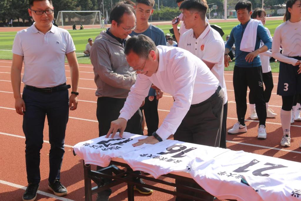在退役仪式环节,即将退役的女足姑娘们向校长赠送了签名足球,感谢他们对女足的关心和爱护,同时各位领导、老师为退役球员球衣签字,感谢女足姑娘为学校奋斗的同时也表示了对退役球员未来美好的展望。