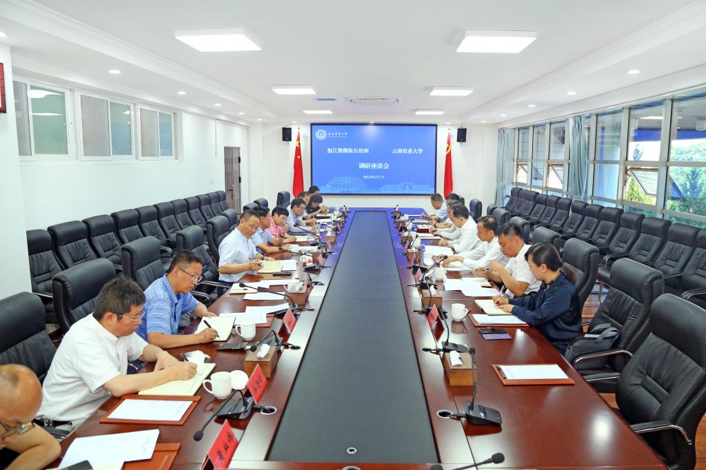 本站消息 6月1日上午,怒江傈僳族自治州委书记洪维智一行来校,就进一步深化州校合作,加大产学研融合,推进高质量人才队伍建设开展调研。学校在耕读楼301会议室召开座谈,中国工程院院士、学校名誉校长朱有勇,学校党委书记黎素梅出席座谈,校长李永和主持座谈,相关学院、部门负责人参加座谈。