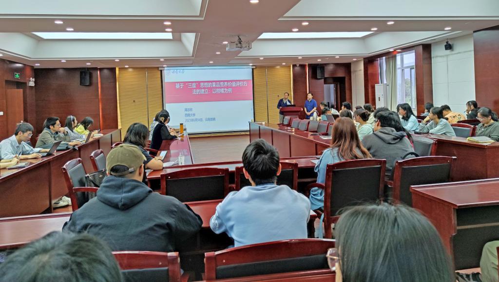 周志钦从目前评价果品营养价值的现状与问题展开报告,围绕果品营养价值“三度”(3D)评价思想的提出,3D营养品质的内涵、外延、评价指标及方法,3D营养品质评价方法的创新点等方面,阐述了3D营养品质评价方法对评价果品营养价值的重要性和应用,并提出了仍待解决的问题和展望。全场报告座无虚席,师生们认真聆听,讲座结束后,师生们积极踊跃提问交流,现场气氛热烈。