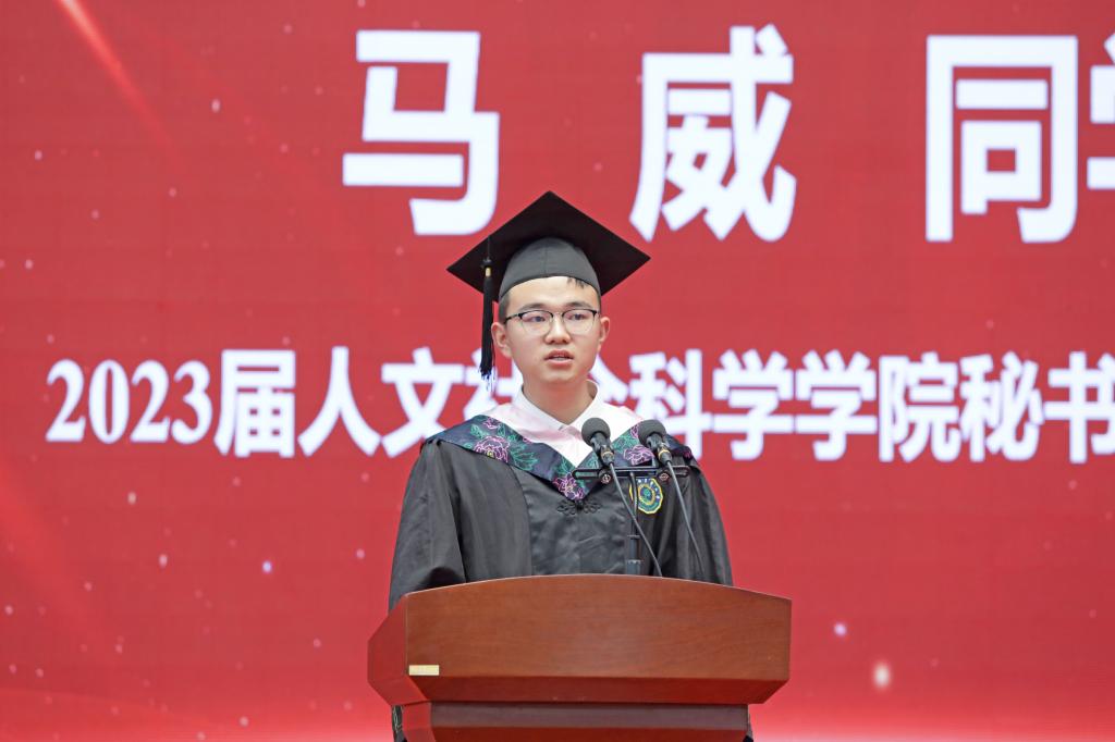 人文社会科学学院2023届秘书学专业马威代表2023届毕业生感恩母校和师长悉心培养、感谢父母和同窗支持帮助,表示在云农校园度过的四年是最灿烂青春时光,踏上人生新的征程,一定牢记“厚德博学,明理尚农”的校训,以名誉校长朱有勇为榜样,努力践行云农人“把论文写在祖国大地上”的热情和执着,“撸起袖子加油干”。