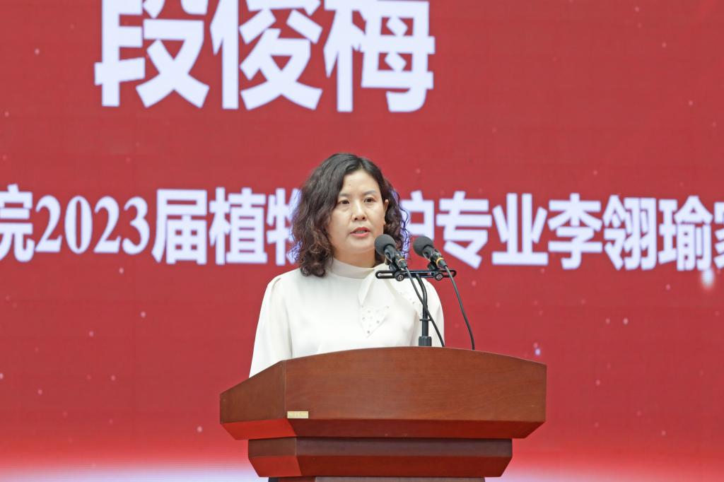 家长代表段俊梅满怀感激之情分享了女儿四年大学的成长和蜕变,学校和老师给予孩子的培养和教育,祝愿毕业生前程似锦,祝愿学校越办越好。