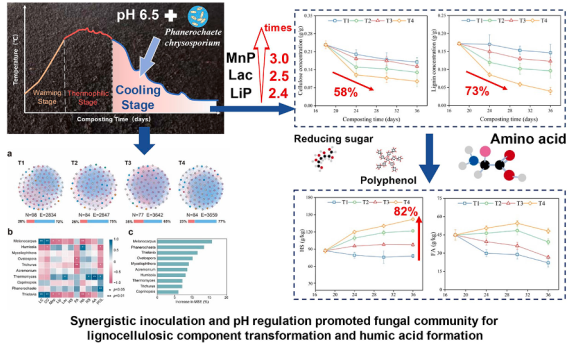 农业废弃物肥料化利用的核心是获得稳定的腐殖质,这是农业废弃物肥料化的高值化利用的基础。徐智教授团队前期的研究表明在堆肥的二次发酵过程中采用木质纤维素强化降解微生物有利于堆肥的腐殖化过程,但堆肥的趋碱化过程可能影响接种的真菌和真菌类群的互作,可能影响生物强化堆肥的腐殖化作用。该文在调节二次堆肥物料pH的基础上,结合微生物强化技术(接种P. chrysosporium),探讨堆肥腐殖化过程的木质纤维素持续降解能力、腐殖酸形成的前体物质和真菌微生物群落的关系,表明调节pH能够有效增加P. chrysosporium的定殖,增加堆肥二次发酵过程中真菌群落的多样性,促进58%的纤维素和73%的木质素降解,使堆肥腐殖质含量增加82%,且Phanerochaete和Thermomyces是堆肥二次发酵过程的木质纤维素降解的关键微生物类群。该研究进一步明确了堆肥腐殖化微生物强化过程和机理,为农业废弃物肥料化的高值化利用提供了理论参考和技术模式。